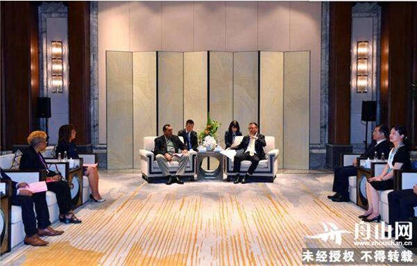 舟山市委书记、新区党工委书记俞东来在朱家尖会见前来参加2019国际海岛旅游大会的斯里兰卡旅游发展国务大臣兰吉特•阿鲁维哈加,塞舌尔旅游、民航、港口和海运部旅游副部长安妮•拉福蒂纳,格林纳达旅游和民航部常务秘书长阿琳•巴克米尔—欧特拉姆等嘉宾。