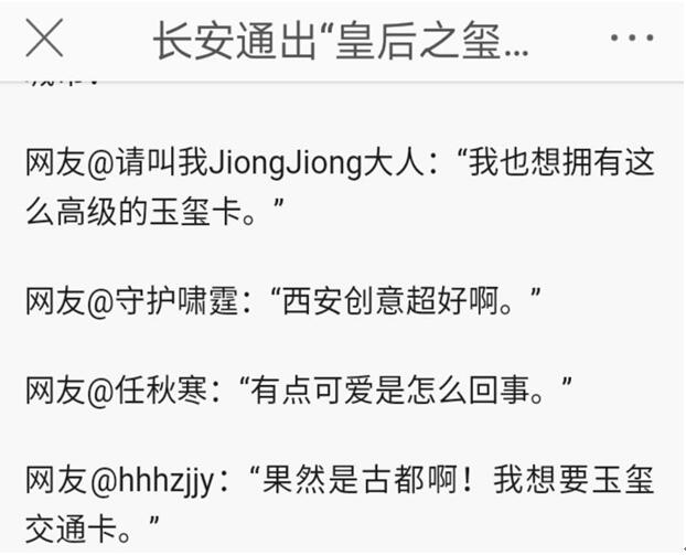 “皇后之玺”公交卡是西安长安通支付有限责任公司与陕历博推出的文创产品,以西汉皇后之玺的模样缩小比例打造。“皇后之玺”为“交通联合”卡,这枚充满历史文化味道的交通互联互通卡,目前在全国交通一卡通互联互通城市名单内225个城市的公交及地铁均可使用。用“皇后之玺”刷卡坐地铁、坐公交车,相信会有一种“君临天下”穿越千年的奇特感受。