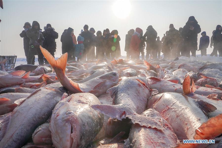 Visitors watch ice-fishing on the Chagan Lake in Songyuan City, northeast China's Jilin Province, Dec. 27, 2019. A winter fishing-themed tourist festival opened on Saturday on the ice-covered Chagan Lake, one of the largest freshwater lakes in China known for its centuries-old tradition of ice-fishing. (Xinhua/Zhang Nan)