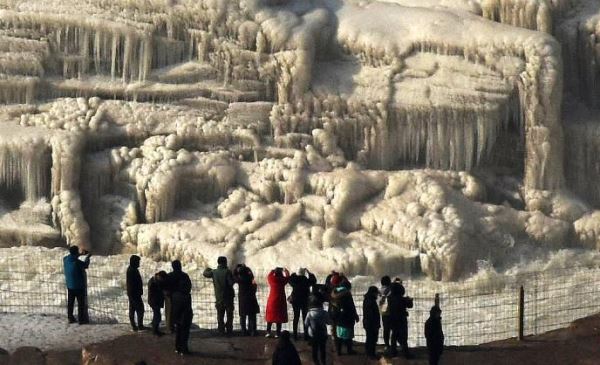 On January 1, 2020, as the temperature continued to drop, the Hukou Waterfall of the Yellow River formed a unique “ice waterfall jade pot” landscape at a grand canyon in North China's Shanxi province. (Photo: China News Service/ Wang Xiaoying)
